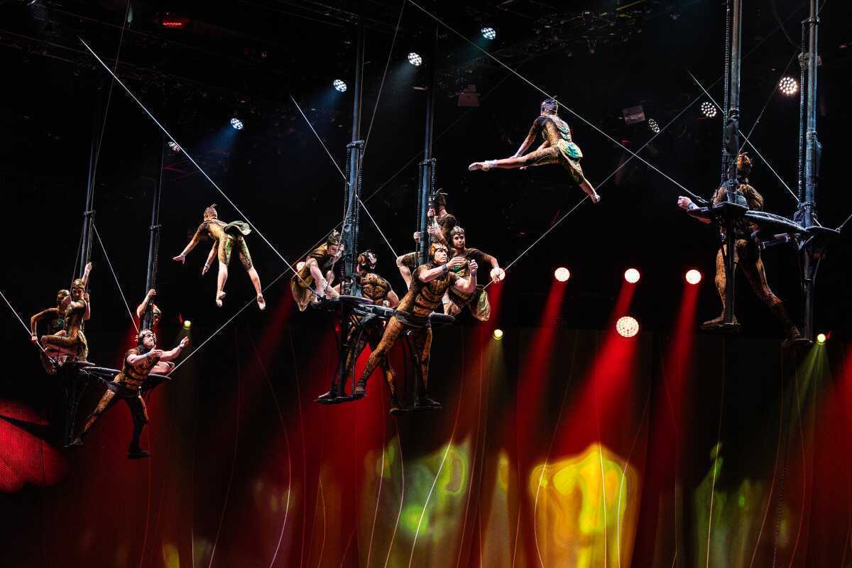The cast of OVO is comprised of 50 performing artists from 12 countries specializing in many acrobatic acts. One highlight of OVO is the stunning Flying Act in which a group of scarabs soar high above the stage, from both edges to the middle landing on a platform.